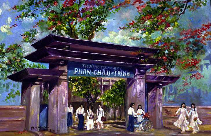 Tôi thường đến Đà Nẵng nhằm lúc học sinh nghỉ học vì thế chỉ thấy trường xưa vàng úa buồn hiu. Tôi thích chụp hình nơi tượng cụ Phan Châu Trinh . Núp sau tượng, đứng trước tượng, làm như thế tôi cảm thấy còn quanh quẩn sống với trường xưa. Rồi một mình lang thang trong sân trường hoang vắng. Chỉ thấy tiếc thương tháng ngày cũ. Ngẫng mặt nhìn lên để ngậm ngùi . Hành lang dài hun hút trên tầng cao, mơ hồ bóng dáng học trò giờ ra chơi xôn xao cười nói. Những khung cửa lớp im lìm , không còn nghe vẳng lời thầy cô giảng bài. Hàng cây trong sân trường giờ đã là cổ thụ, vẫn tỏa bóng mát êm đềm. Chạnh thương qúa vạt nắng đổ lung linh. Sân trường và hoa nắng có bao giờ mình nguôi quên ...
